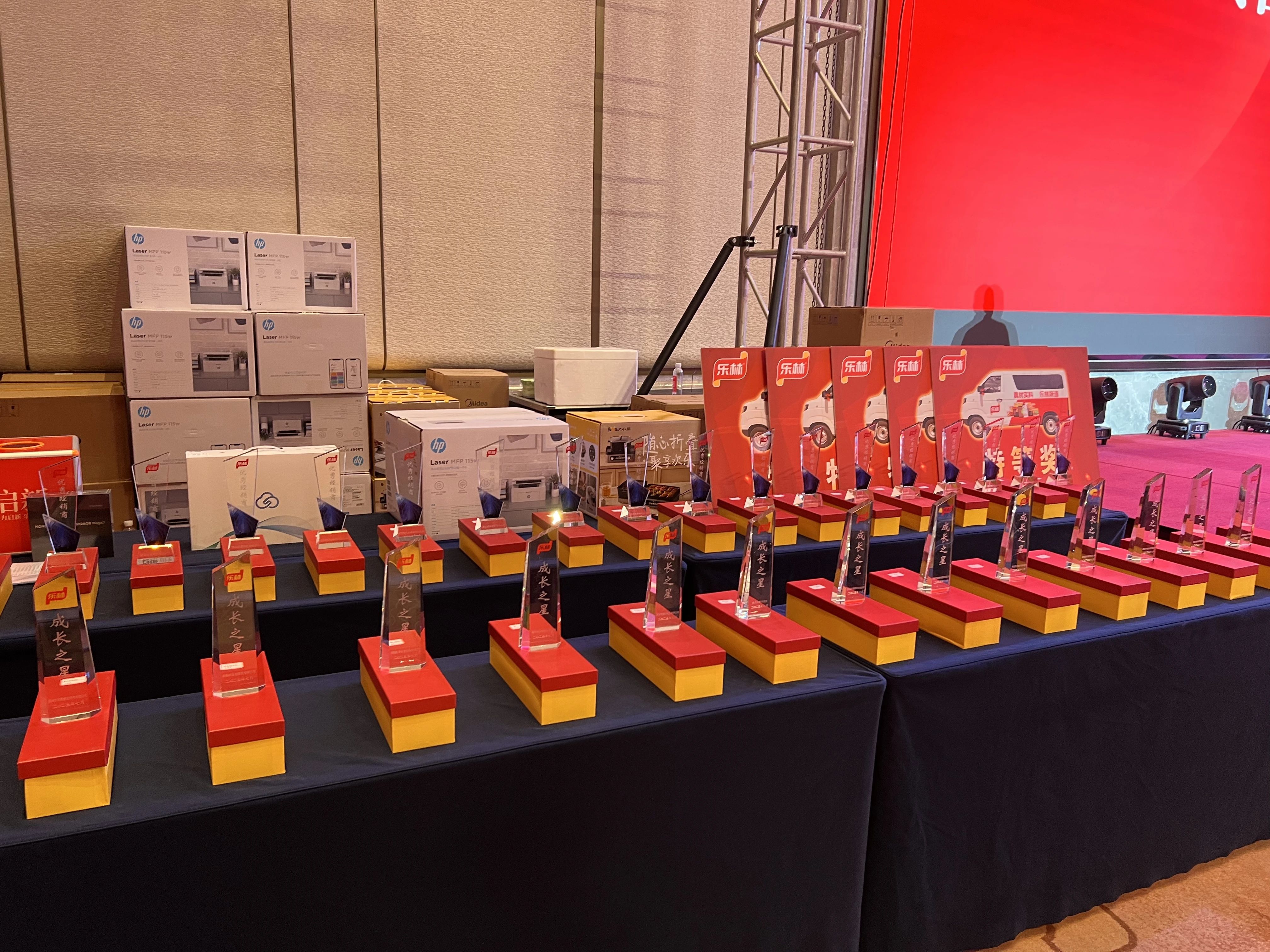 樂林大區(qū)經(jīng)理王澤喜先生,詳細(xì)介紹了樂林六大產(chǎn)品系列及近年新品與未來規(guī)劃,打款政策宣講緊隨其后,手機(jī)筆記本商用電車等眾多獎品,點(diǎn)燃全場熱情。大會迎來情感沸點(diǎn)——年度頒獎,“成長獎”是銳意進(jìn)取的新銳力量;“優(yōu)秀獎”是走向全國市場的中流砥柱;“卓越貢獻(xiàn)獎”則是對風(fēng)雨同舟、業(yè)績卓著伙伴的最高禮贊。